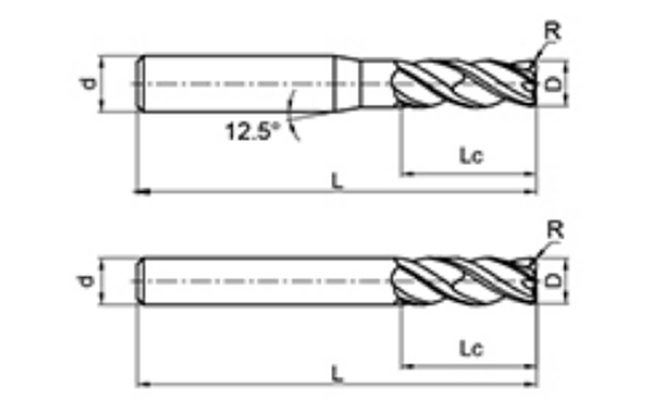| Ei | Halkaisija D | R-kulma R | Huilun pituus Lc | Kokonaispituus L | Shank Dia d | Terien määrä F |