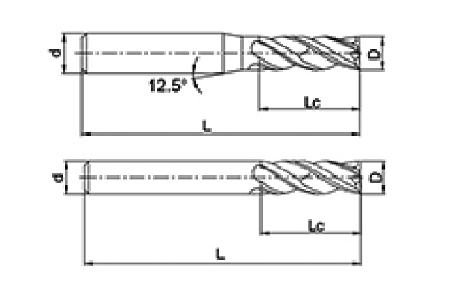 | Ei | Halkaisija D | Huilun pituus Lc | Kokonaispituus L | Shank Dia d | Terien määrä F |