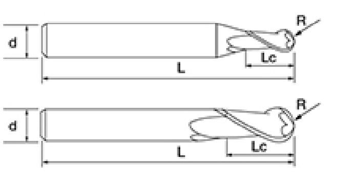 | Ei | Halkaisija D | R-kulma R | Huilun pituus Lc | Kokonaispituus L | Shank Dia d | Terien määrä F |