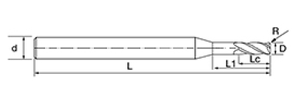| Ei | Halkaisija D | R-kulma R | Huilun pituus Lc | Tehokas pituus L1 | Kokonaispituus L | Shank Dia d | Terien määrä F |