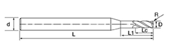 | Ei | Halkaisija D | R-kulma R | Huilun pituus Lc | Tehokas pituus L1 | Kokonaispituus L | Shank Dia d | Terien määrä F |