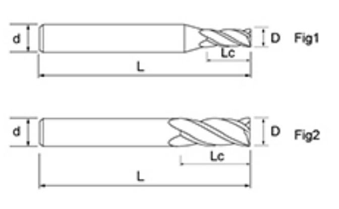 | Ei | Halkaisija D | Huilun pituus Lc | Kokonaispituus L | Shank Dia d | Terien määrä F |